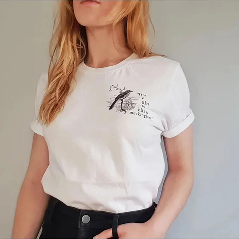 This is a relaxed fit, unisex t-shirt inspired by To Kill a Mockingbird featuring a crew neck, short sleeves and a unique literary emblem – perfect for tucking, cropping, or wearing free - however you prefer!